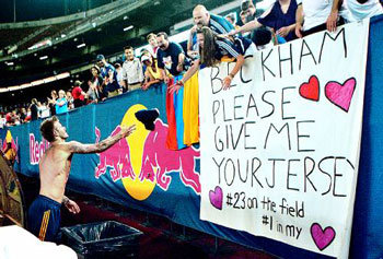 戴维•贝克汉姆(左下,LA银河队)17日在纽约新泽西州巨人体育场以3比1战胜职业足球纽约红牛队后,将球衣脱下送给了手持巨型“请给我球衣”横幅的球迷。