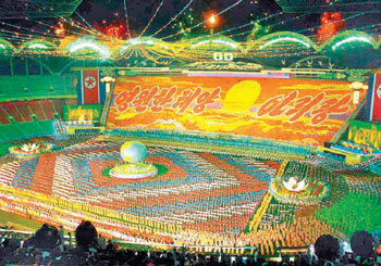 据悉,朝鲜为了在本月10日开幕动员10万名群众进行的综合艺术表演-阿里郎公演,正在竭尽全力进行准备。图为,去年8月份在平壤绫罗道5•1竞技场举行的阿里郎公演的场面。