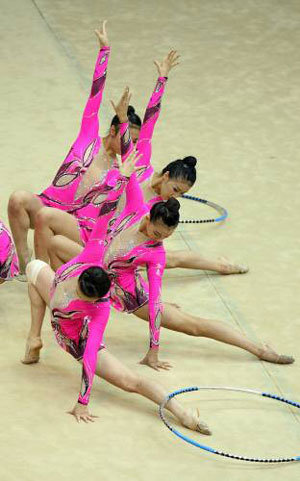 本月6日,在金浦室内体育馆举行的第22届全国大奖赛赛前,将参加下个月日本世界锦标赛的国家艺术体操队选手们,正在做吊环赛前示范。