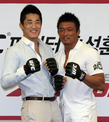 本月14日,在7月份综合格斗大赛中分获冠军的秋成勋(右侧)和金东炫,于首尔中区“Korea Press Center”举行的记者招待会上握拳面对镜头。秋成勋表示:“往后的比赛上,将同时携带韩国国旗和日本国旗出战。” 金东炫表示:“将努力学习儿时偶像秋成勋的奋斗精神和斗志,要站在UFC的顶峰。”