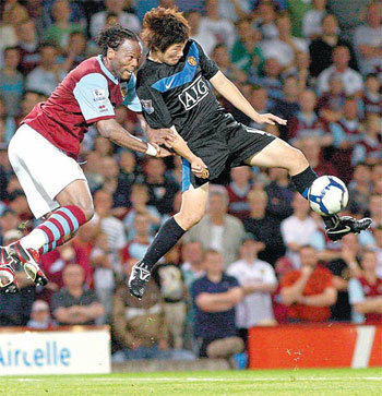 本月20日,在英国兰开夏州特富摩尔球场,与升班马伯尔尼利的客场比赛中,曼联队员朴智星与对方球员争抢高球。虽然朴智星打满全场,但表现一般。曼联最终以0比1战败。