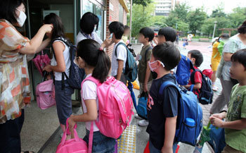 27日,在首尔龙山区的某小学校,为了防止甲型H1N1在学校内发生集体感染,戴着口罩的教师们正在用耳朵用体温计一一检查上学学生们的体温。