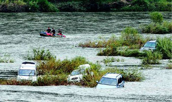 消防员正展开搜索工作。被水冲走的小轿车在水面上“游来游去”。