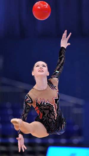 阿利娜•马克西门克(乌克兰)9日在日本三重县伊势市举行的艺术体操世界选手大赛预赛中,上演了迷人的球技。