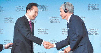 李明博总统(左)21日(当地时间)在美国纽约参加了由美国外交协会(CFR)、韩国社会、亚洲社会共同主办的午餐讨论会,正与负责主持的美国前任财务长官罗伯特•鲁宾(CFR共同理事长)打招呼。