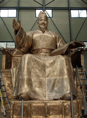 本月25日,计划于下个月的朝鲜语日(10月9日)竖立在首尔光化门广场上的世宗大王铜像,于京畿道利川市雪星面的制作公司工作间中,展现出非凡气度。包括基垫,高10.4米的铜像,已完成95%,仅剩下上色和打磨工序。铜像左手拿着的是“训民正音解例本”,向着左边的右手手掌,意味着拥抱百姓的领导者风范。