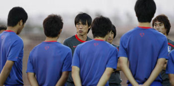 1日在埃及苏伊士玛瑞娜练习场,青少年足球代表队教练洪明甫(左二)在开始训练前向选手们传达指示事项。韩国队要在3日进行的与美国20岁以下青少年世界杯C组最后比赛中获胜,才能进入16强。