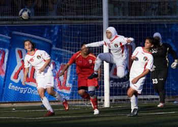 戴着希迦的约旦女子足球代表队的塞纳-马恩省得•贾夫利耶(中间)26日在巴勒斯坦阿拉姆西坝城阿拉姆球场上举行的与巴勒斯坦代表队的友谊赛中正在接球。这是巴勒斯坦和约旦首次进行女子足球对抗赛,两队以2比2扳平。