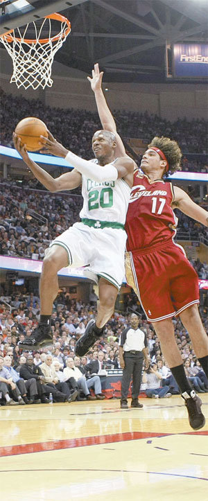 新赛季美国职业篮球联赛正式揭幕。28日,于克里夫兰骑士速贷篮球馆举行的2009-2010赛季NBA揭幕战上,波士顿凯尔特人队的雷•阿伦(左侧)正晃过克里夫兰骑士的安德森•瓦莱乔,欲上篮得分。最终,2007-2008赛季总冠军波士顿凯尔特人队,以95比89战胜对手,迎来新赛季开门红。