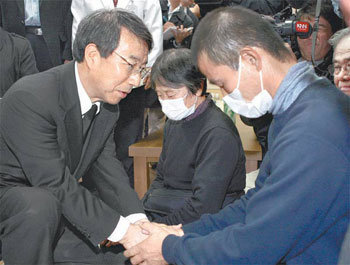 15日,国务总理郑云灿(左侧)来到安置釜山室内实弹射击场火灾惨案牺牲者的庆南梁山釜山大学医院太平间,安抚日本死者家属。日死者家属们表示:“韩国政府要彻底调查清楚事故原因,并致力于防止事故的再次发生。”