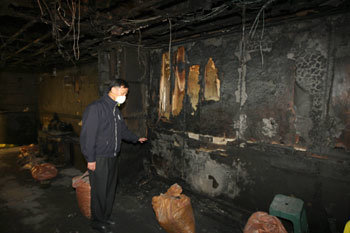 18日,發生火災事故造成包括7名日本旅客在內的11人死亡的釜山室內射擊場,在經過四天之後,第一次向輿論界公開了其火災現場。開始展開鑒定工作的警署科學調查隊的相關人士,正用手指向漆黑一片的2樓出口。
