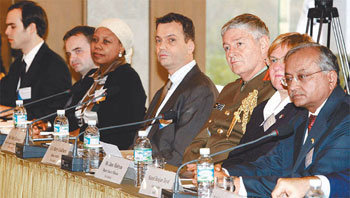 7日,在首尔中区广场饭店举行的“驻韩联合国参战国家大使及军队人士邀请,6•25六十周年纪念工作说明会”上,与会者们正在聆听国家保勋处长金扬的说明。驻韩英国大使马丁等21个国家联合国参战国家大使和美国军队人士凯文等50多人参加了当天的会议。