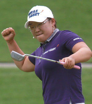“微笑天使”申智爱(21岁)轻击入洞后的欢呼动作显得非常稳健。本赛季,申智爱获得了180万7334美元(约20亿韩元)奖金,成为了首位登顶LPGA巡回赛奖金榜的韩国选手。同时,她也将南希•洛佩兹(美国)于1978年创造的最年轻奖金王记录提前了4个月。