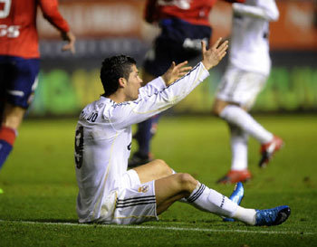 4日,西甲联赛皇家马德里队的前锋C•罗讷尔多,在萨达尔球场挑战奥萨苏纳的比赛中错失得分良机,无奈的举着双手自责。