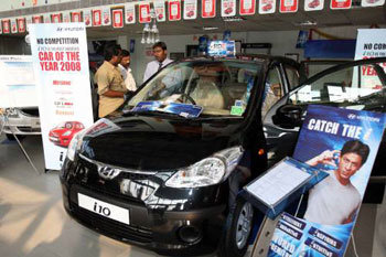 在位于印度的现代汽车专卖店,当地商人正出售小型车“i10”。据统计,印度汽车市场去年增长18.7%,并纪录史上最高销售纪录。