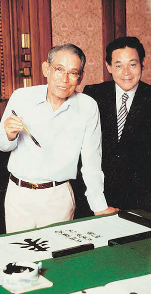 湖岩(右)平时很喜欢书法。1985年,在自己的办公室写毛笔字的湖岩(李秉喆的号)和当时担任三星物产副董事长的湖岩之子李健熙,一同拍了这张照片。