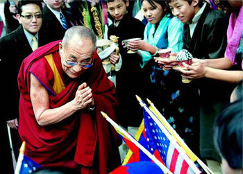 17日,经由美国华盛顿杜勒斯国际机场进入美国的西藏精神领袖达赖喇嘛(74岁)正与出来迎接的人士打招呼。达赖喇嘛以参加在美西藏人士迎新年活动开始了正式访问日程。18日他将在白宫与美国总统奥巴马会面,之后也计划与国务卿希拉里会面。