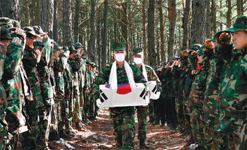 浦项特别警戒地区司令部于15日表示,8日至11日期间在庆北盈德地区进行6.25战士的遗体挖掘工作,找出了头盖骨、骨盘、下颚等9具遗体与钢笔等238件遗物。将兵正在搬运盖好太极旗的遗体。
