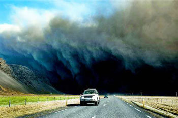 17日,一些车辆驶过喷发火山灰和烟尘的冰岛南部埃亚菲亚德拉冰盖火山附近的道路。专家指出,火山爆发的余波所导致的航空大乱要比2001年9•11恐怖袭击事件更加严重。目前,航空业界和物流、旅游业界等都遭受了巨大的打击。
