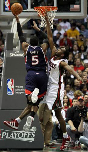 美国职业篮球联赛东部联盟8强赛(7战4胜制)第四场比赛中,亚特兰大老鹰队前锋乔石•史密斯(左)躲过米尔沃基雄鹿队卢克•姆巴莫特的防守,试图扣篮。最终以111:104战胜的亚特兰大老鹰以2胜2败的成绩回到了到原点。
