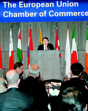 外交通商部长官柳明桓,19日在首尔中区奖忠洞新罗酒店迎宾馆举办的驻韩EU商工会议所午餐演讲上,发表了以“天安舰沉没事故因鱼雷爆炸引起”为宗旨的演说。