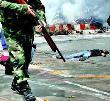 将泰国首都曼谷卷入“战争状况”并达到流血事态的反政府示威最终以强制镇压告终。当地时间19日上午6点,泰国政府投入40余辆装甲车和数千名军兵力与警察冲破示威队在商业区扎营设下的路障,占领了反政府“红衫军”示威队的地盘,从而镇压长达两个月的反政府示威。位于政府军身旁的一位示威者的尸体真令人惨不忍睹。