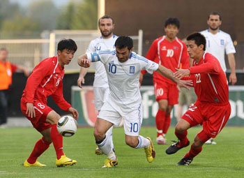 26日,奥地利竞技场举行了与朝鲜代表队的热身赛,“希腊的朴智星”吉奥吉奥斯•卡拉古尼斯(中间)正试图突破安英学(右侧)与志尹南。