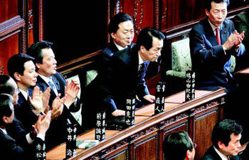 日本民主党代表菅直人(左侧第三位)4日被当选为第94任首相。通过日本众议院和参议院的投票选举被当选为日本首相的菅直人在中井洽公安委员长兼绑架问题负责人(左侧)和国土交通相(左侧第二位)、鸠山由纪夫前首相(左侧第四位)的掌声中,向支持自己的议员表示感谢。