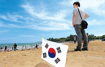9日,韩国首枚运载火箭——罗老号(KSLV-I)因发射台的消防设施出现问题而延迟发射。图中,太极旗飘荡在全南高兴郡南悦海水浴场沙滩上。