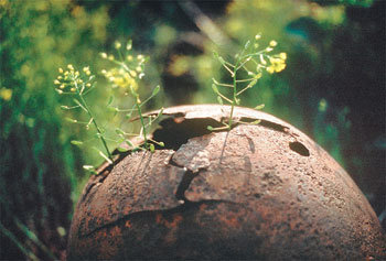 在生锈的铁帽中间长出了野花。我们似乎听到了被枪击中的士兵的声音。“让和平之花开满全世界。”这是笼罩非军事化区(DMZ)的生命呐喊。