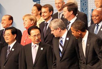 27日(当地时间),出席加拿大多伦多20国(G20)首脑会议的李明博总统(前排左数第二),在多伦多会议中心拍摄纪念合影之前,正与右边的加拿大总理史蒂芬•哈珀及美国总统奥巴马交谈。第一排左数依次为中国国家主席胡锦涛、李明博总统、哈珀总理、奥巴马总统。第二排左数依次为意大利总理贝卢斯科尼、德国总理默克尔、西班牙总理何塞•路易斯•罗德里格斯•萨帕特罗、荷兰总理扬•彼得•巴尔克嫩德、南非共和国总统雅各布•祖马。