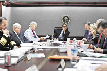 美国总统奥巴马的外交安保参谋们不仅要顾及到美国的安保,还要考虑到世界安保。对这些人来说夜晚并不是无忧无虑的休息时间。在上午4点喝蛋白质饮料的麦克尔联合参谋议长(左)和回家后也要在家研讨秘密文件的埃瑞克法务长官(右)的24小时也是充满了紧张。外交安保人员熬夜做出来的保安档将会成为第二天在白宫召开的安保会议(中)的主要讨论事项。