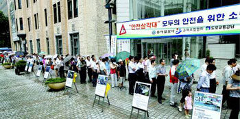 14日在首尔钟路区世宗路东亚媒体中心前,有很多市民排队领取安全三角架。为了宣传交通法规与汽车安全装置的重要性,东亚日报和损害保险协会道路交通工团携手准备了此次活动。
