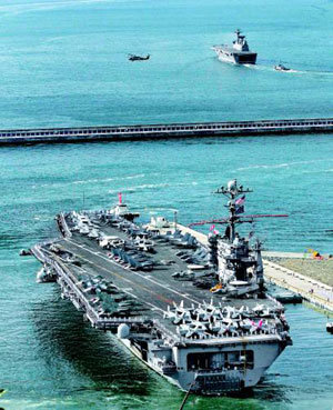 美国第七舰队航空母舰乔治华盛顿号(下侧)和韩国韩军1万4000吨级舰独岛号(上侧)正为美韩联合军演而驶离釜山港。