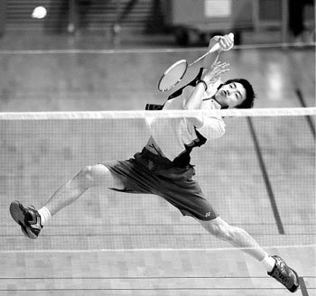 李龙大奥运纪念碑全国中小学羽毛球大赛高中部单人决赛中,忠州工业高中安炳国选手正在攻击光明北高中李洪济选手。安炳国选手以2-1的成绩打败李洪济选手,荣膺冠军。