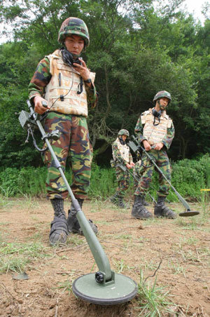 1日上午,陆军第25师团飞龙部队士兵们正在用探测仪在京畿道涟川郡百鹤面战洞里民间人统制线内的临津江支流附近探测木盒地雷。