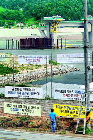 4日下午,环境运动联合所占据的京畿道骊州郡大神面伊浦普施工现场对面,当地居民挂着的支持四大江项目的横幅,四处可见。环境团体在伊浦普上方挂了大型的写有“倾听国民之声”的横幅。与此相对应,居民们挂上了写有“外人不要干预”的横幅。