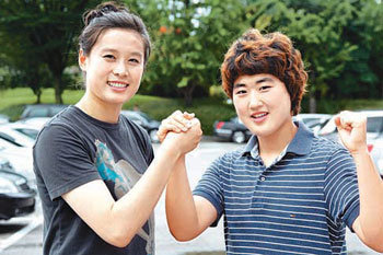 女子代表队看起来信心十足的样子。确实,由20岁以下女性构成的女子足球代表队近期在德国女子世界杯取得了第三名的成绩。这是在世界足联(FIFA)主管的大赛中取得的最高成绩。因此,女子足球代表队成为焦点。其中最引人注目的是“美女守门员”文素利(音•20岁•蔚山科学大学)和对抗加纳队时远距离射门成功的金罗来(音•20岁•骊州大学)。本报记者好不容易见到了4日回国后忙得不可开交的两位选手。