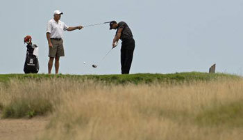 成绩一蹶不振的泰格•伍兹(右侧)10日为了迎战12日开幕的PGA冠军杯赛,在举办大赛的场地进行赛前训练。并且在9号洞,在球童Steve William的帮助下发第一球。