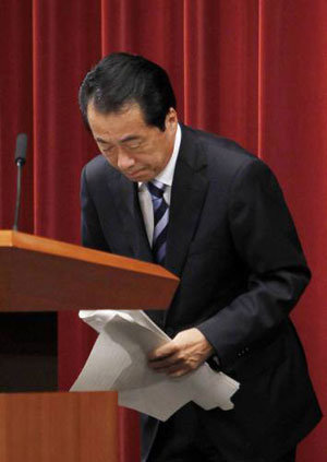 10日下午,日本首相菅直人在首相官邸举行的记者招待会上,低头行礼。当天上午,菅直人发表谈话,对于殖民统治造成的损失和痛苦,致歉。