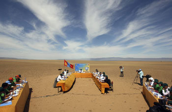 蒙古政府8月27日在与首都乌兰巴托远离670km的南戈壁省的一处沙质山谷举行了内阁会议,以吸引人们对气候变化问题的关注。蒙古国12名政府部长身着西装,打着领带,戴着深绿色的棒球帽,帽子上写着“拯救我们的地球”。并在火毒的太阳光下举行了一个小时的会议。这个地方是受到气候变化影响的地方。5年前,这里食用植物茂盛,但如今就像照片上所显示的,沙质山谷继续在增多。
