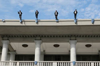 G20峰会警卫安全团旗下的警卫们8日在青瓦台迎宾馆展示了绕绳索从高处往下的绕绳下降示范。青瓦台记者团