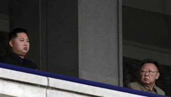 10日,于平壤金日成广场进行的朝劳动党建党65周年阅兵式中,朝鲜国防委员长金正日(右侧)正看着坐在身边的三子金正恩。金正恩目前司职朝鲜党中央军事委员会副委员长。
