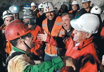 13日凌晨1点(当地时间),智利总统皮涅拉(右边)迎接着在智利圣何塞铜矿救援现场上第二个被救出来的Mario Sepulveda Espina(人名)。在这个奇迹般的救援现场上,为了救援过程上的安全,禁止了所有一般内外信记者们的接近。此照片是智利政府拍摄并提供的。