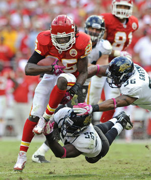 25日,北美职业橄榄球联盟(NFL)堪萨斯城酋长的跑锋查尔斯(左)在与Jackson Jaguars举行的比赛中,甩掉了对方的后卫,奔驰着。最后,堪萨斯城以42:40获胜。