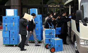 27日上午,正调查韩化集团秘密资金案件的首尔西部检察院搜查人员正在韩化酒店度假村开展查封工作,他们将装满资料的纸箱搬进了车。当天,检察人员扣押了28个装满文件的纸箱。