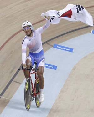 本届广州亚运会上,四年前多哈亚运会时的三冠王张仙軩(韩国,26岁)蝉联了场地自行车赛4公里个人追逐赛冠军。张仙軩于14日在广州大学城进行的金牌争夺赛中,以4分30秒298通过终点,领先香港选手张敬乐(4分37秒543),蝉联了此项赛事冠军。图为,夺金后后高举太极旗大声欢呼的张仙軩。