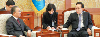 李明博总统(右)28日在青瓦台会见了以中国国家主席胡锦涛和胡锦涛总理的特使身份访韩的外交部国务委员戴秉国,并对朝鲜的延坪岛炮击挑衅交换了意见。