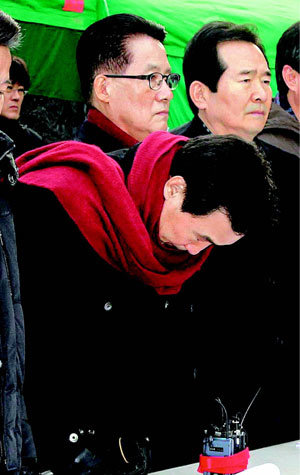 10日,在首尔市政厅前首尔广场举行的党最高委员会议过程中,民主党代表孙鹤圭(前)就未能阻止四大江项目预算议案,向国民表示道歉。孙代表右侧为院内代表朴智元及最高委员丁世均。