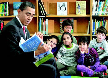 17日,美国总统奥巴马突访位于弗吉尼亚州的一所小学,并给小学生们讲述了童话故事。图片中奥巴马手持的童话书是奥巴马本人所写的《我歌颂你:写给女儿们的一封信》。